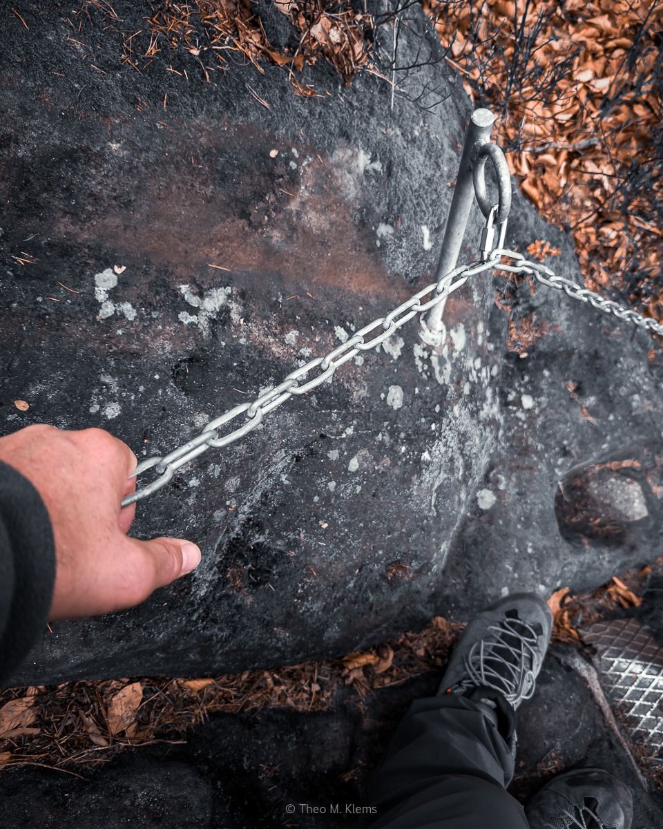 Hier verändert sich der Charakter der Tour deutlich. Der Weg wird steiler und führt über unregelmäßige Steinstufennach oben. Teilweise helfen Ketten, um den Aufstieg zu erleichtern.