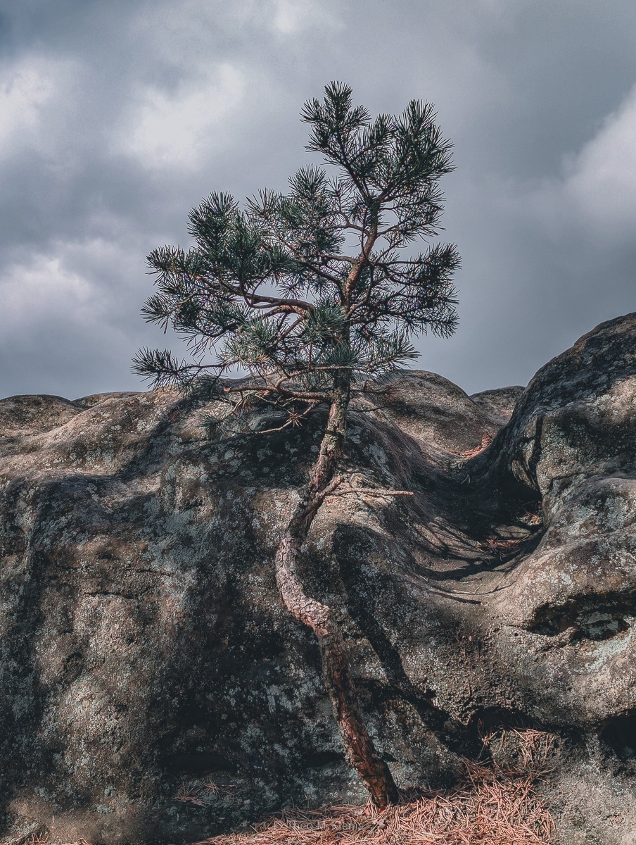Der Aufstieg zum Großen Teichstein endet nicht einfach an einem Aussichtspunkt. Oben führt ein schmaler Weg über den Felsgrat weiter durch die Sandsteinformationen. Links und rechts fällt der Fels ab, während einzelne Kiefern aus dem Gestein wachsen.
