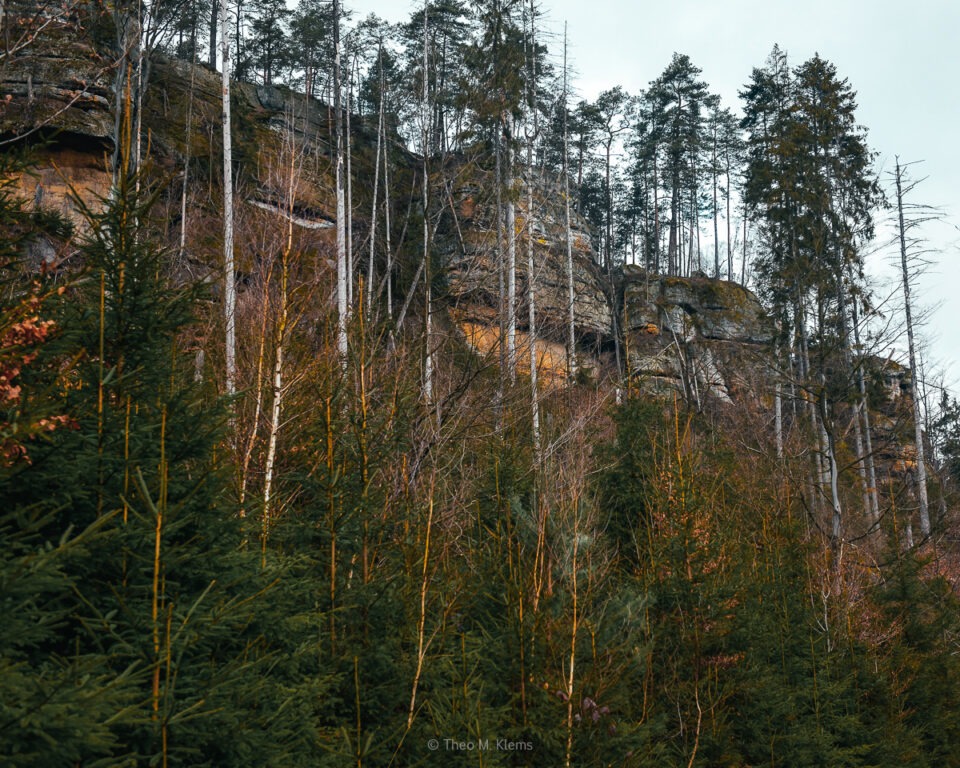 Zwischen den Bäumen tauchen immer wieder typische Sandsteinformationen auf – erste Hinweise darauf, dass der eigentliche Felsenbereich der Tour noch bevorsteht.