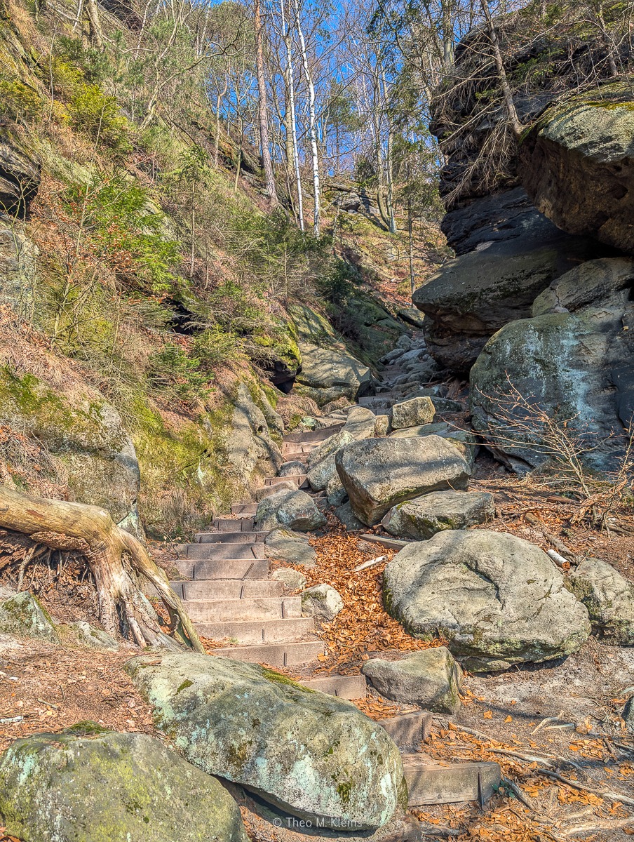 Weiter führt der Weg auf dem Elbleitenweg. Noch begleitet der Wald den Weg, doch die Landschaft beginnt sich zu öffnen. Erste Felsen tauchen auf, und mit ihnen dieses typische Gefühl des Unterwegsseins im Elbsandstein.