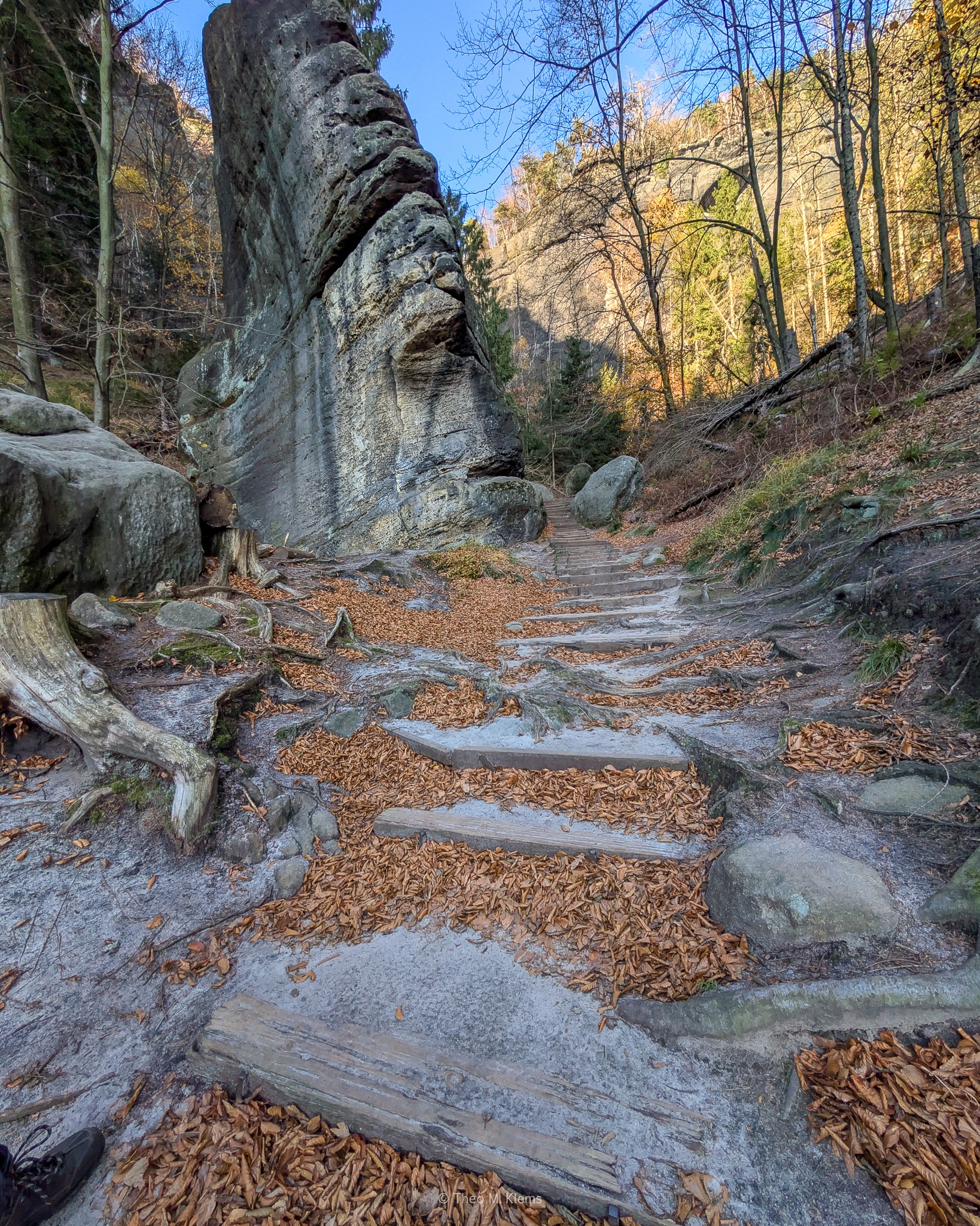 Der Weg verläuft über Treppen, Felsstufen und schmale Pfade entlang der Sandsteinwände. Immer wieder öffnen sich beeindruckende Blicke über das Elbtal und die zerklüftete Felsenlandschaft.