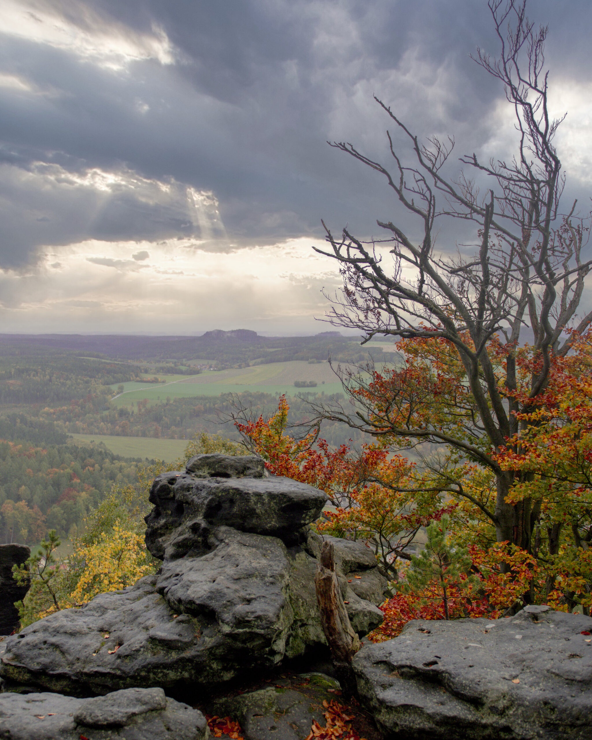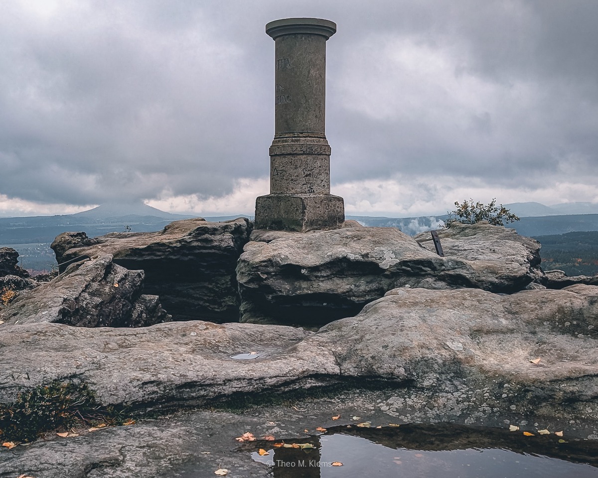 Unter schwerem Himmel entfaltet sich eine stille Weite. Der Große Zschirnstein zeigt Fläche, der Kleine Struktur. Zusammen bilden sie einen Übergang – zwischen Landschaften, zwischen Ländern, zwischen zentraler und randständiger Sächsischer Schweiz.
